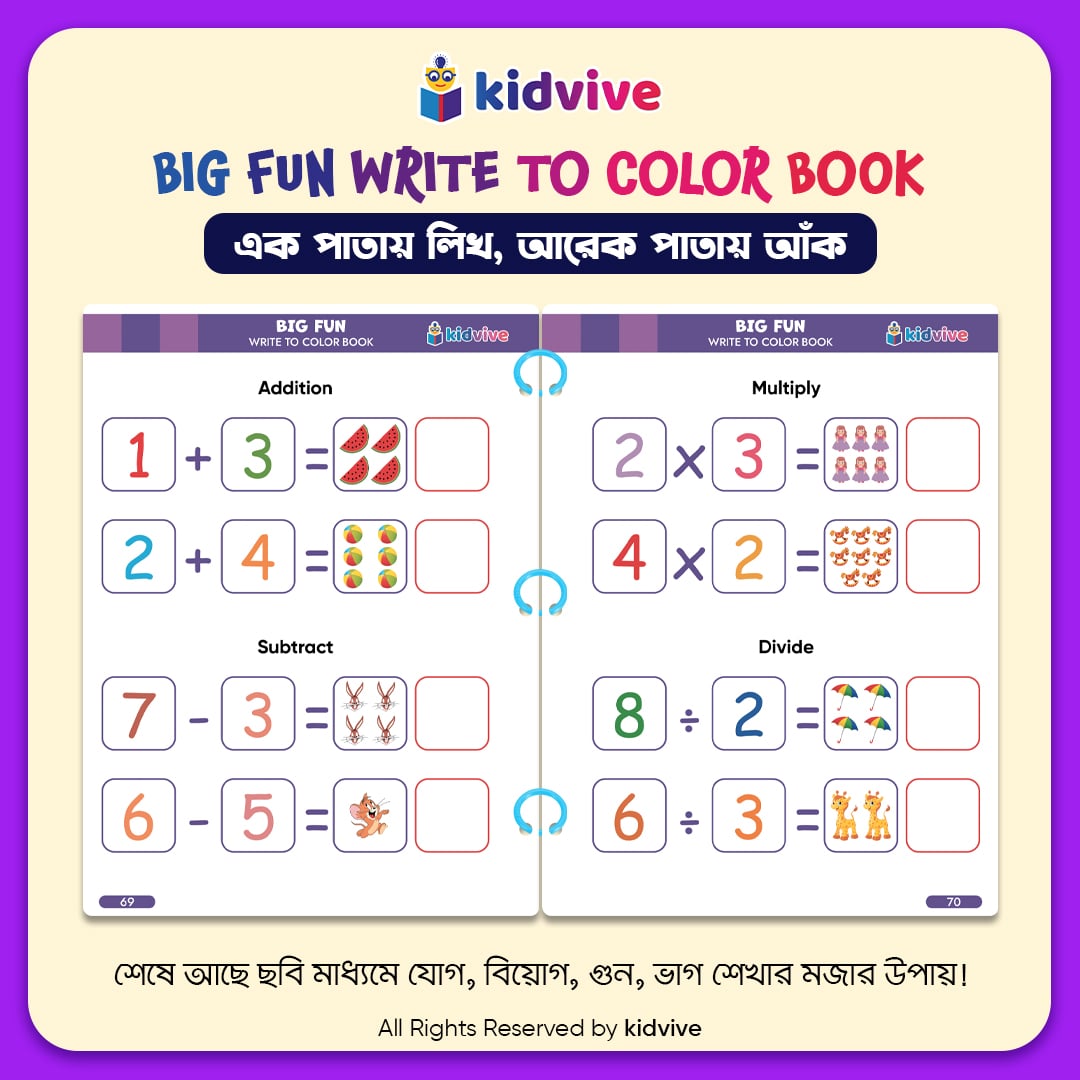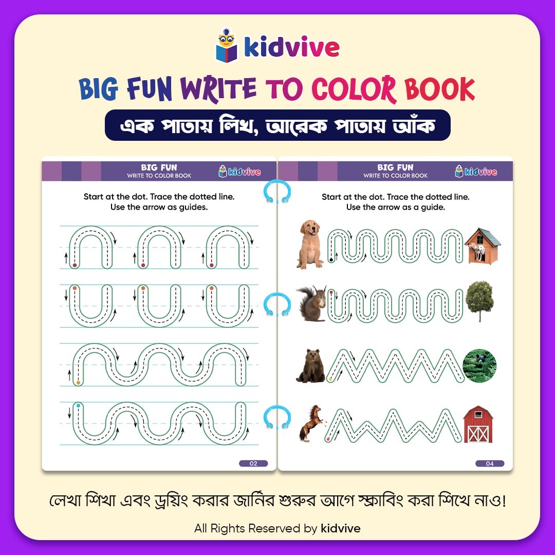 Kidvive Big Fun Write to Color Book এমন একটি বই যেখানে বাচ্চারা এক পাতায় লিখতে শিখবে, আরেক পাতায় আঁকবে, color করবে এবং matching activity করবে।