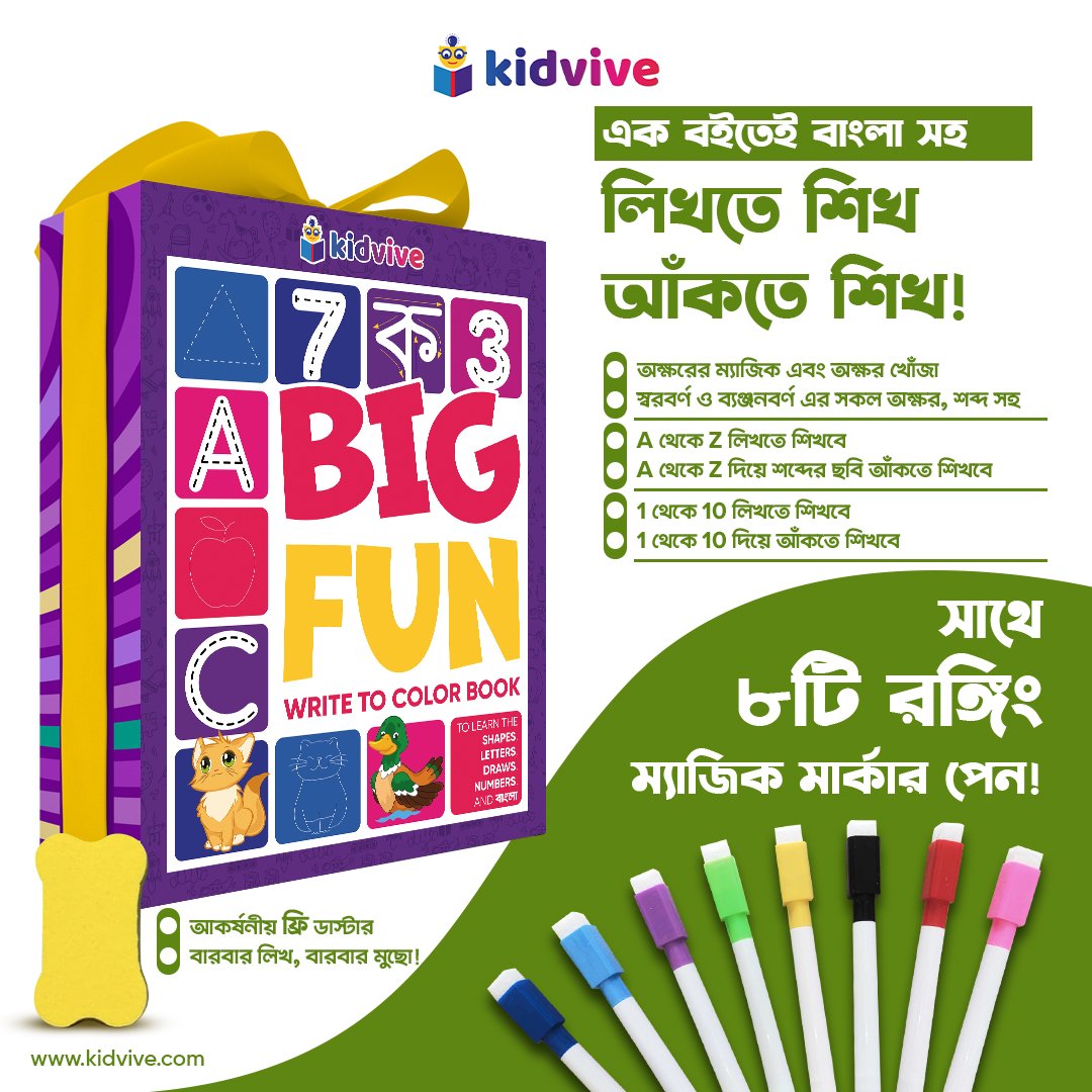 Kidvive Big Fun Write to Color Book এমন একটি বই যেখানে বাচ্চারা এক পাতায় লিখতে শিখবে, আরেক পাতায় আঁকবে, color করবে এবং matching activity করবে।