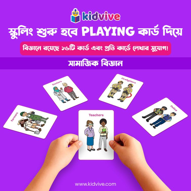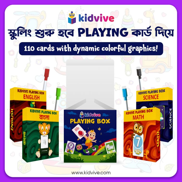 Kidvive Playing Box এমন একটি মজার Learning Card Box যেখানে খেলতে খেলতেই বাচ্চারা শিখতে পারবে বাংলা, ইংরেজি, গণিত, বিজ্ঞান এবং সামাজিক বিজ্ঞান।
